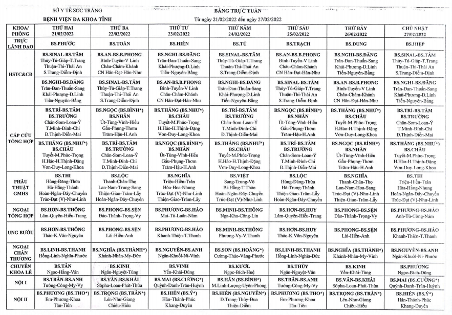 LỊCH TRỰC TUẦN TỪ NGÀY 21/02/2022 ĐẾN NGÀY 27/02/2022