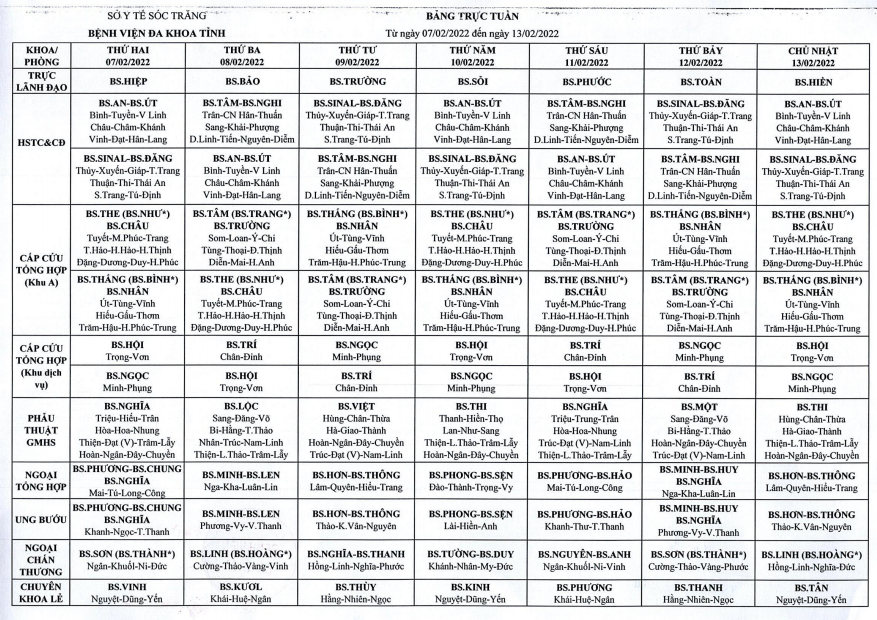 LỊCH TRỰC TUẦN TỪ NGÀY 07/02/2022 ĐẾN NGÀY 13/02/2022
