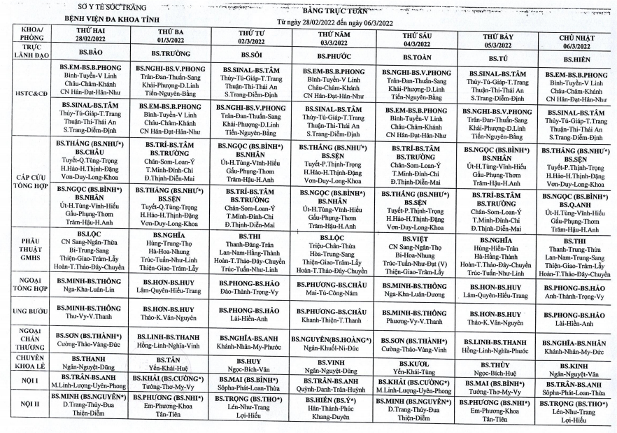 LỊCH TRỰC TUẦN TỪ NGÀY 28/02/2022 ĐẾN NGÀY 06/03/2022