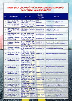 Trong trường hợp khẩn cấp, người dân liên hệ số điện thoại trực cấp cứu theo danh sách đính kèm nhằm tiếp nhận, xử lý kịp thời thông tin yêu cầu cấp cứu tai nạn giao thông của người dân. Các đơn vị khám chữa bệnh trong tỉnh Sóc Trăng luôn chuẩn bị đủ thuốc, vật tư, thiết bị y tế và nhân lực đáp ứng cấp cứu 24/24 giờ. Rất mong tất cả người dân cùng chung tay thực hiện và tuyên truyền thông công tác đảm bảo trật tự an toàn giao thông trên địa bàn tỉnh Sóc Trăng