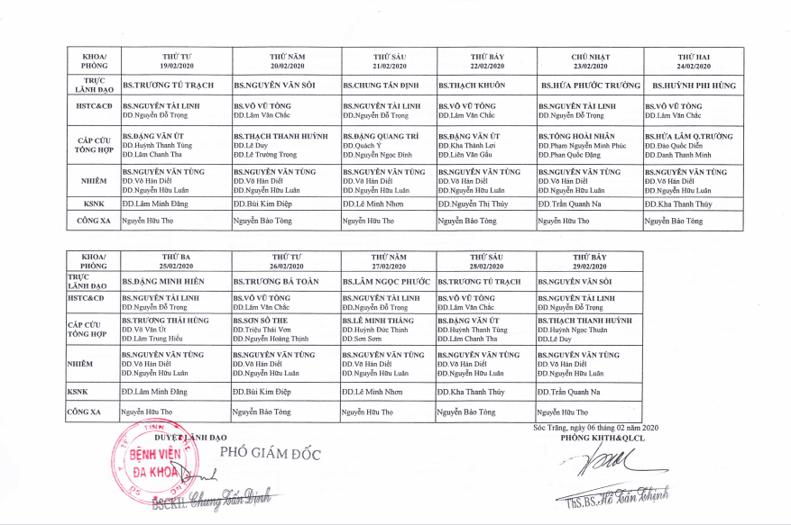 Lịch trựcBẢNG THƯỜNG TRỰC PHÒNG CHỐNG DỊCH 09 Th2 BỆNH VIÊM ĐƯỜNG HÔ HẤP DO VIRUS CORONA CHỦNG MỚI (nCoV)