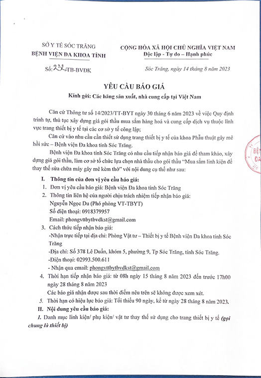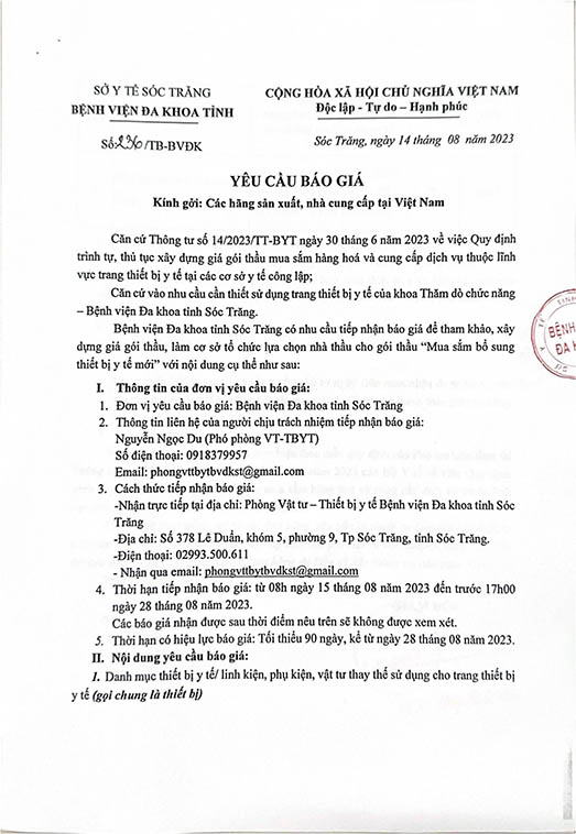 YÊU CẦU BÁO GIÁ Thông báo số 236/TB-BVĐK ngày 14/8/2023