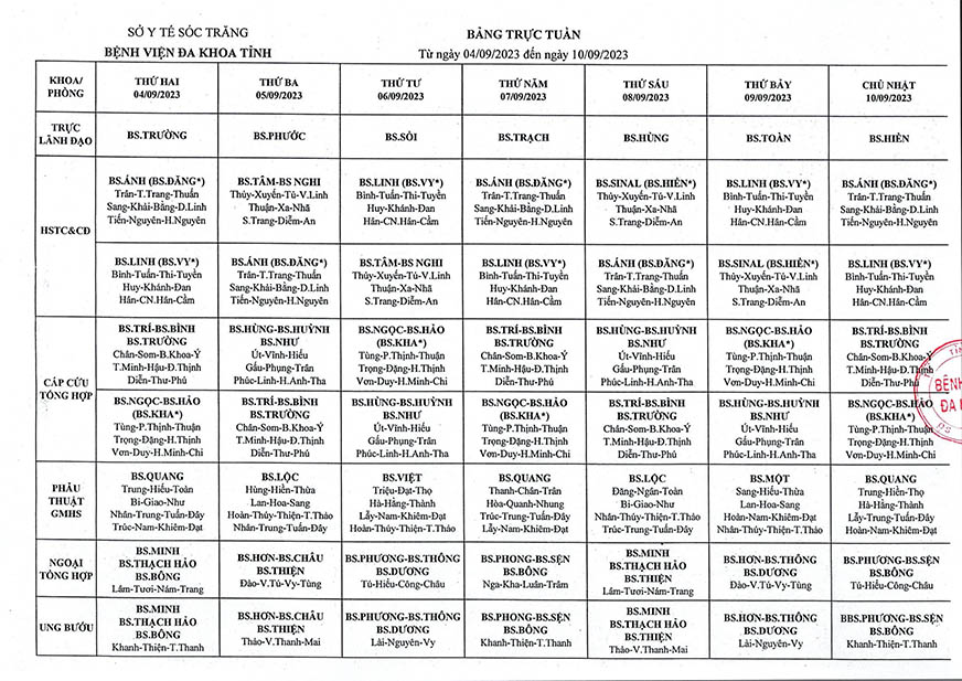 LỊCH TRỰC TUẦN TỪ NGÀY 04/9/2023 ĐẾN HẾT NGÀY 10/9/2023