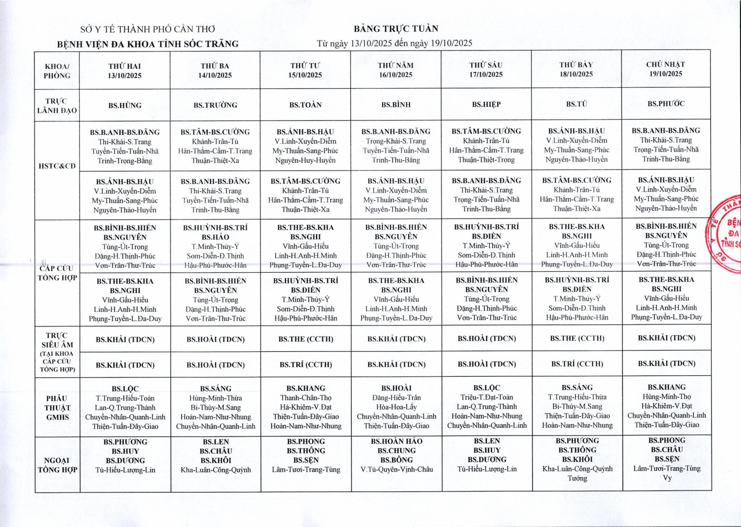 LỊCH TRỰC TUẦN TỪ NGÀY 13/10/2025 ĐẾN HẾT NGÀY 19/10/2025