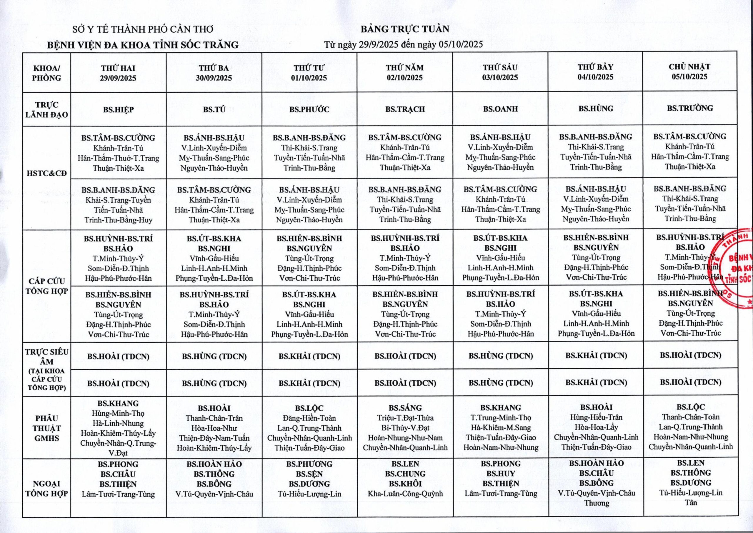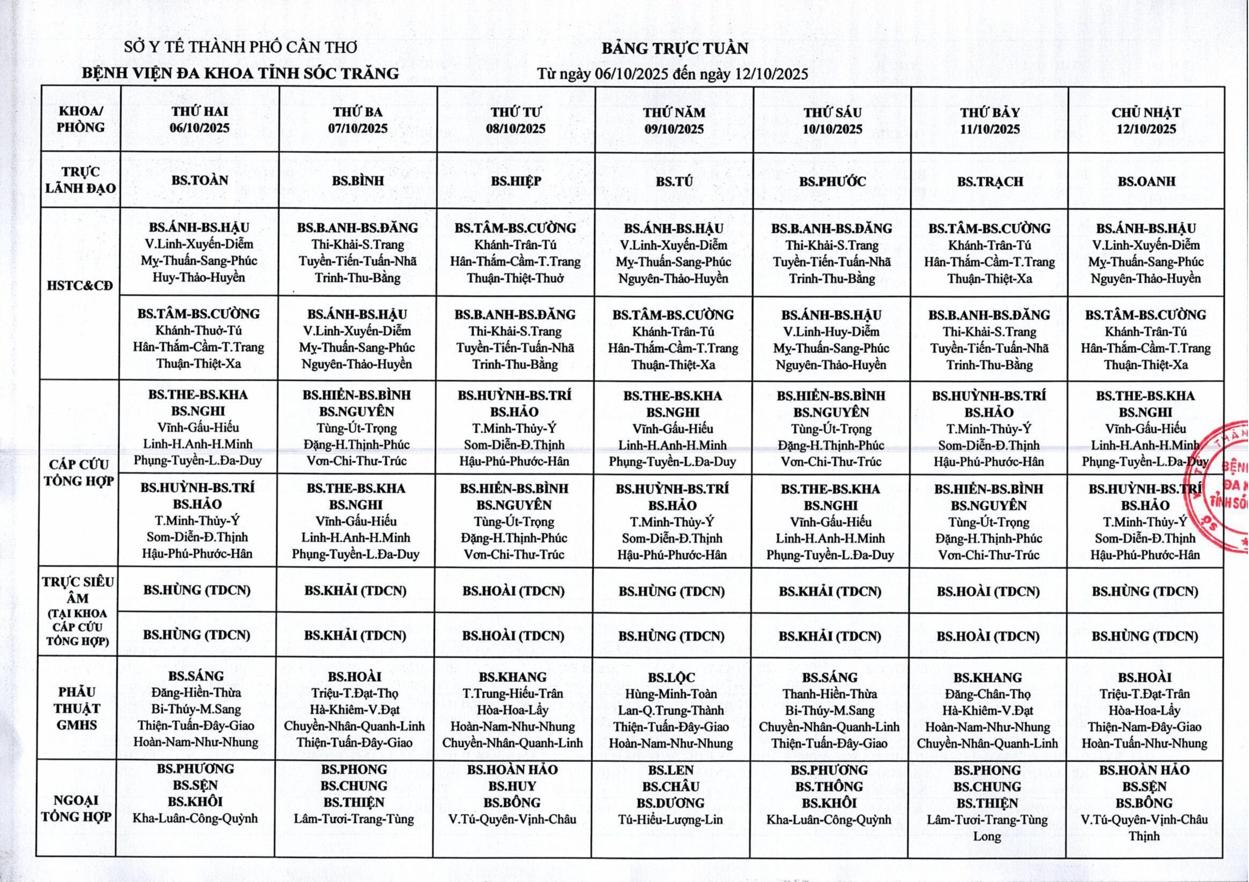 LỊCH TRỰC TUẦN TỪ NGÀY 06/10/2025 ĐẾN HẾT NGÀY 12/10/2025