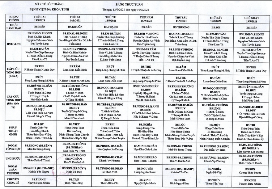 LỊCH TRỰC TUẦN TỪ NGÀY 13/9/2021 ĐẾN NGÀY 19/9/2021