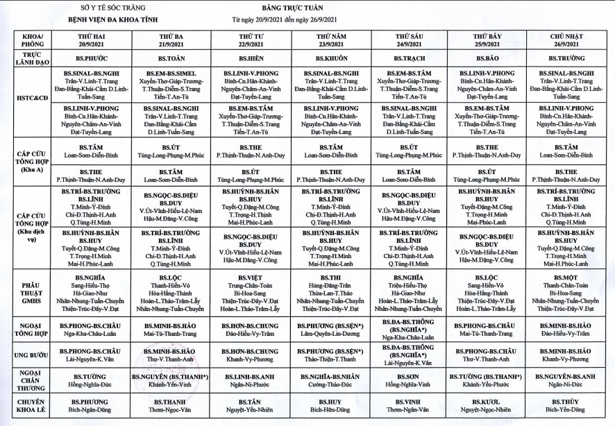 LỊCH TRỰC TUẦN TỪ NGÀY 20/9/2021 ĐẾN NGÀY 26/9/2021