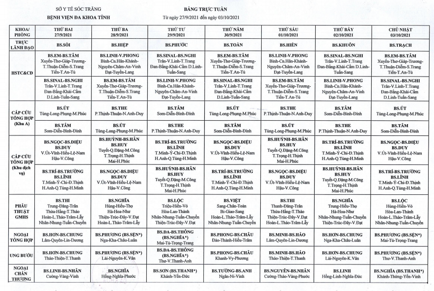 LỊCH TRỰC TUẦN TỪ NGÀY 27/9/2021 ĐẾN NGÀY 03/10/2021