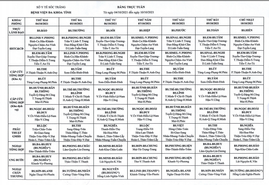 LỊCH TRỰC TUẦN TỪ NGÀY 04/10/2021 ĐẾN NGÀY 10/10/2021