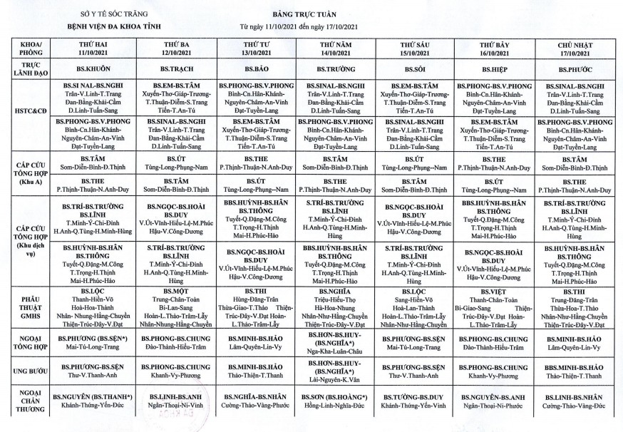 LỊCH TRỰC TUẦN TỪ NGÀY 11/10/2021 ĐẾN NGÀY 17/10/2021