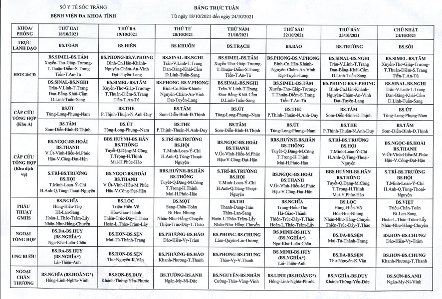 LỊCH TRỰC TUẦN TỪ NGÀY 18/10/2021 ĐẾN NGÀY 24/10/2021