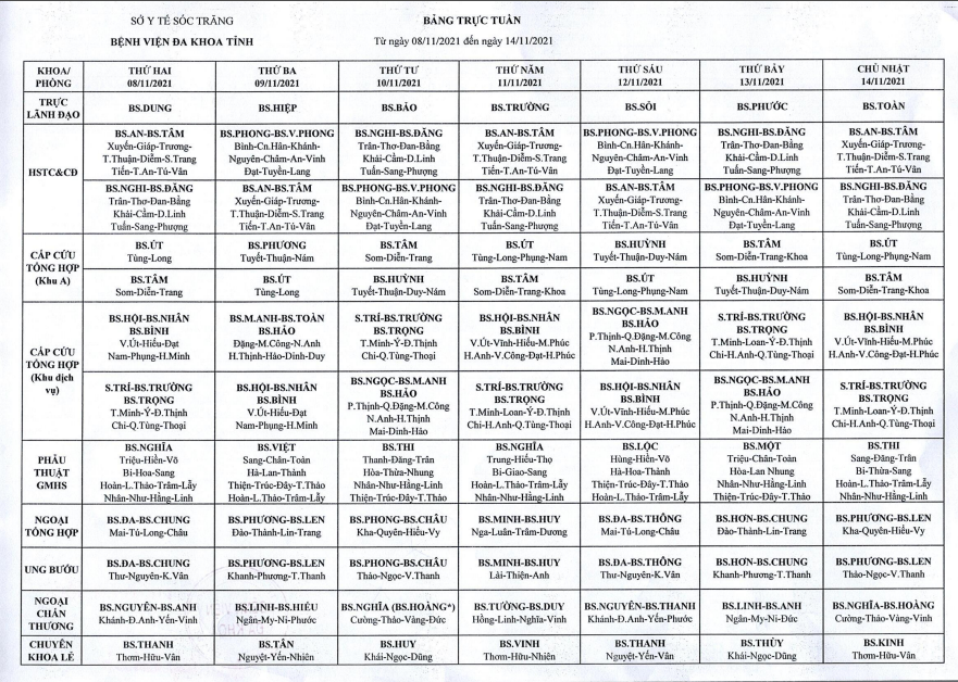 LỊCH TRỰC TUẦN TỪ NGÀY 08/11/2021 ĐẾN NGÀY 14/11/2021