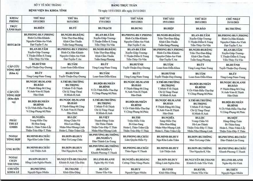 LỊCH TRỰC TỪ NGÀY 15/11/2021 ĐẾN NGÀY 21/11/2021