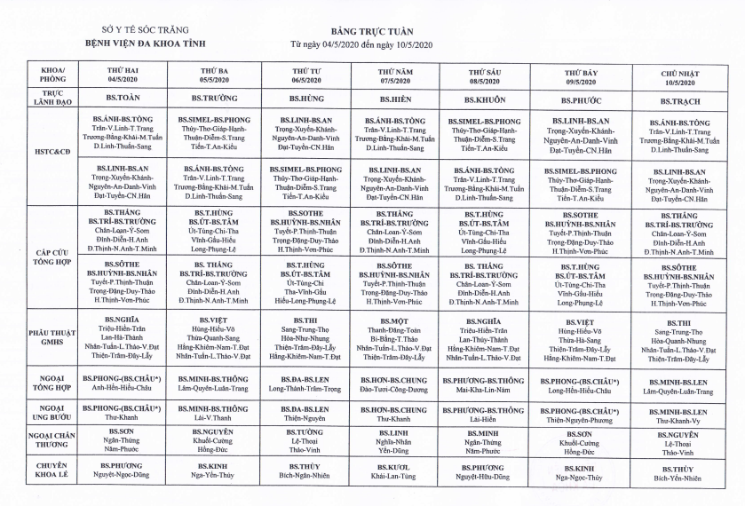 LỊCH TRỰC TUẦN TỪ NGÀY 04/5/2020 ĐẾN NGÀY 10/5/2020