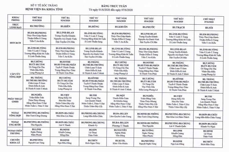 LỊCH TRỰC TUẦN TỪ NGÀY 6/7/2020 ĐẾN NGÀY 12/7/2020