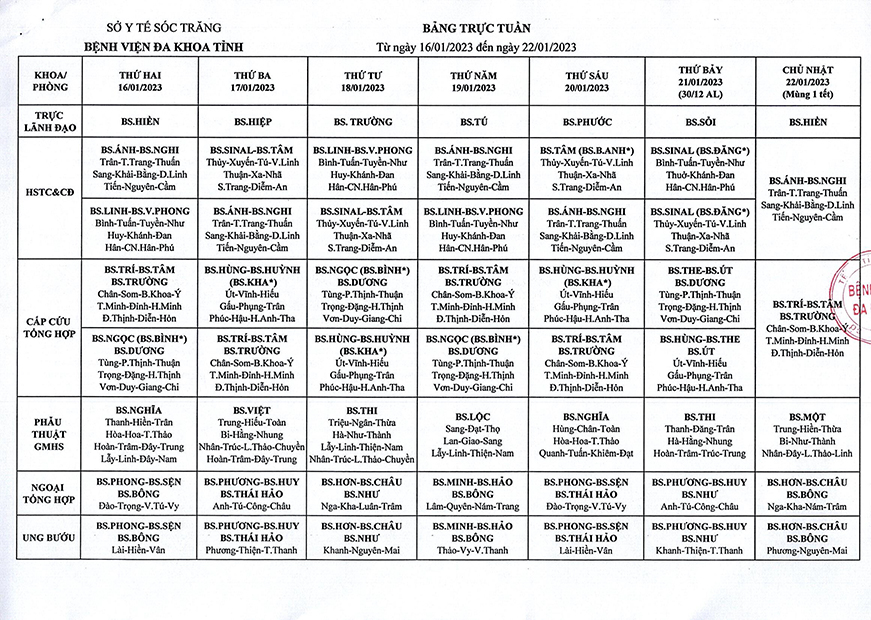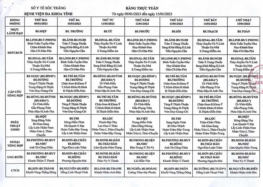 LỊCH TRỰC TUẦN TỪ NGÀY 09/01/2023 ĐẾN NGÀY 15/01/2023