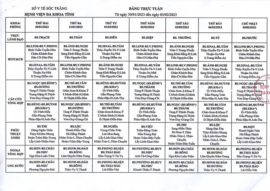 LỊCH TRỰC TUẦN TỪ NGÀY 30/01/2023 ĐẾN NGÀY 05/02/2023