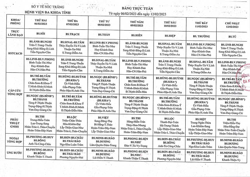 LỊCH TRỰC TUẦN TỪ NGÀY 06/2/2023 ĐẾN NGÀY 12/2/2023