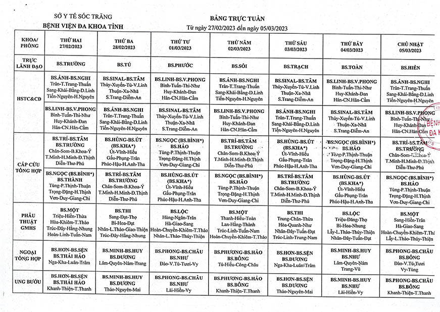 LỊCH TRỰC TUẦN TỪ NGÀY 20/02/2023 ĐẾN NGÀY 26/02/2023