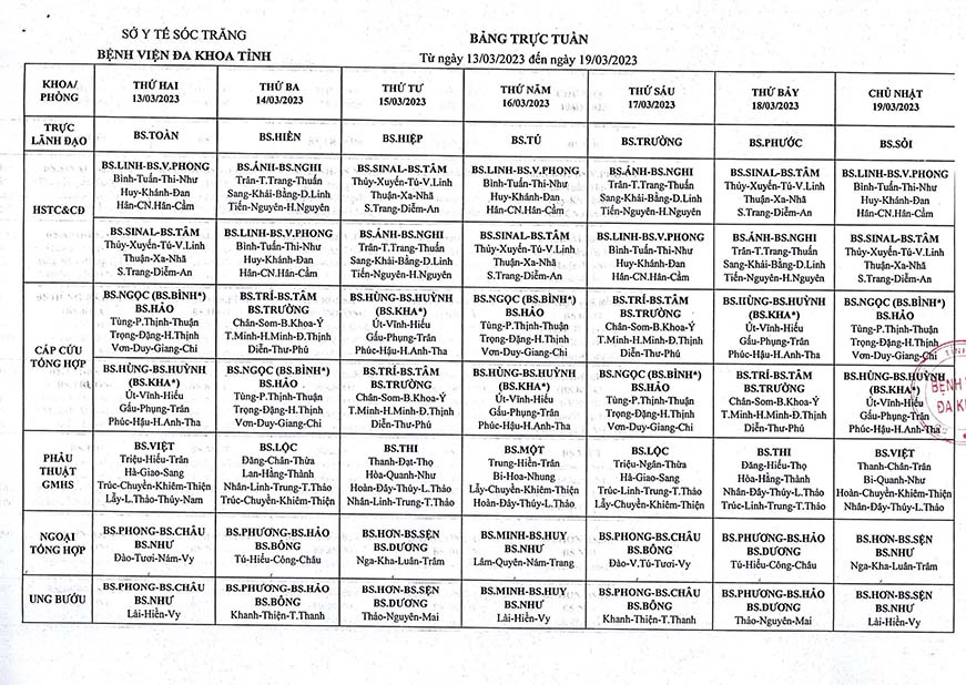 LỊCH TRỰC TUẦN TỪ NGÀY 13/3/2023 ĐẾN NGÀY 19/3/2023