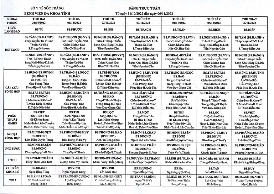 LỊCH TRỰC TUẦN TỪ NGÀY 31/10/2022 ĐẾN NGÀY 06/11/2022