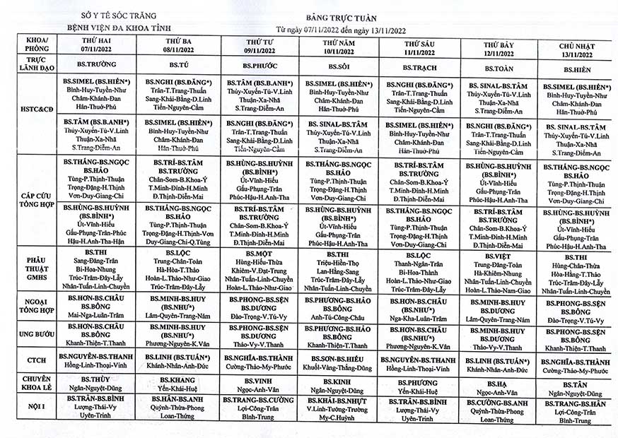 LỊCH TRỰC TUẦN TỪ NGÀY 07/11/2022 ĐẾN NGÀY 13/11/2022