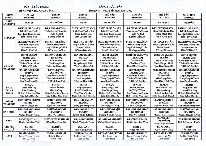 LỊCH TRỰC TUẦN TỪ NGÀY 14/11/2022 ĐẾN NGÀY 20/11/2022