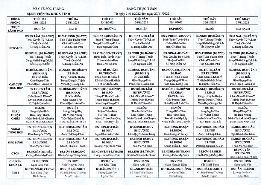 LỊCH TRỰC TUẦN TỪ NGÀY 21/11/2022 ĐẾN NGÀY 27/11/2022