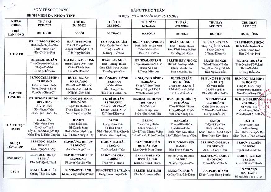 LỊCH TRỰC TUẦN TỪ NGÀY 19/12/2022 ĐẾN NGÀY 25/12/2022
