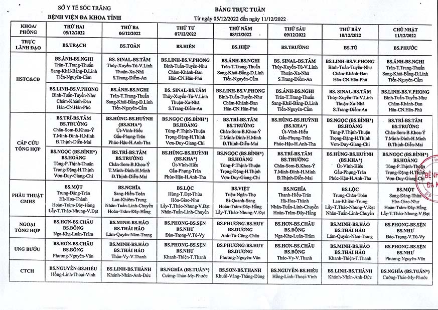 LỊCH TRỰC TUẦN TỪ NGÀY 05/12/2022 ĐẾN NGÀY 11/12/2022
