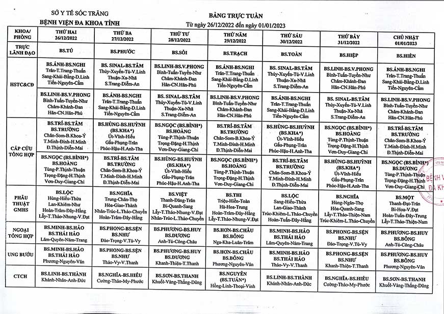 LỊCH TRỰC TUẦN TỪ NGÀY 26/12/2022 ĐẾN NGÀY 01/01/2023