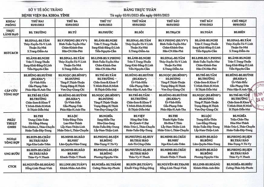 LỊCH TRỰC TUẦN TỪ NGÀY 02/01/2023 ĐẾN NGÀY 08/01/2023