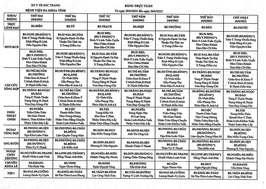LỊCH TRỰC TUẦN TỪ NGÀY 20/6/2022 ĐẾN NGÀY 26/6/2022