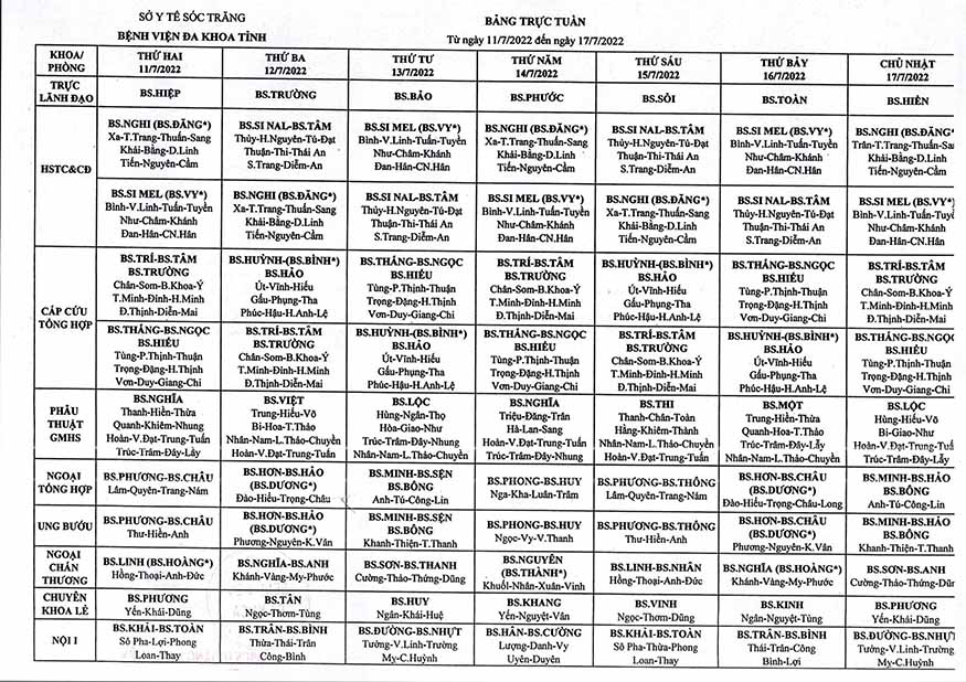 LỊCH TRỰC TUẦN TỪ NGÀY 11/7/2022 ĐẾN NGÀY 17/7/2022
