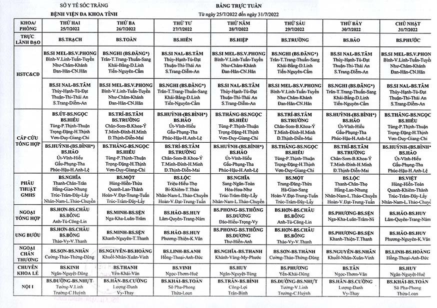 LỊCH TRỰC TUẦN TỪ NGÀY 25/7/2022 ĐẾN NGÀY 31/7/2022