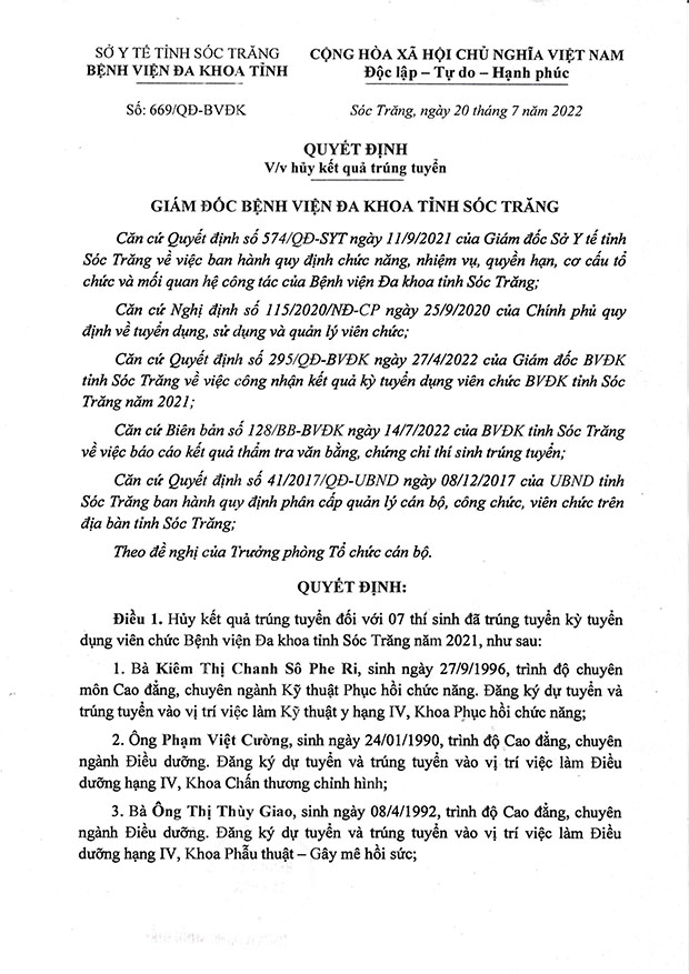 Quyết định Số 669/QĐ-BVĐK, ngày 20 tháng 7 năm 2022 về việc hủy kết quả trúng tuyển đối với 07 trường hợp sử dụng văn bằng, chứng chỉ, chứng nhận không đúng quy định để tham gia dự tuyển và không tiếp nhận Phiếu đăng ký dự tuyển trong một kỳ tuyển dụng tiếp theo của Đơn vị.