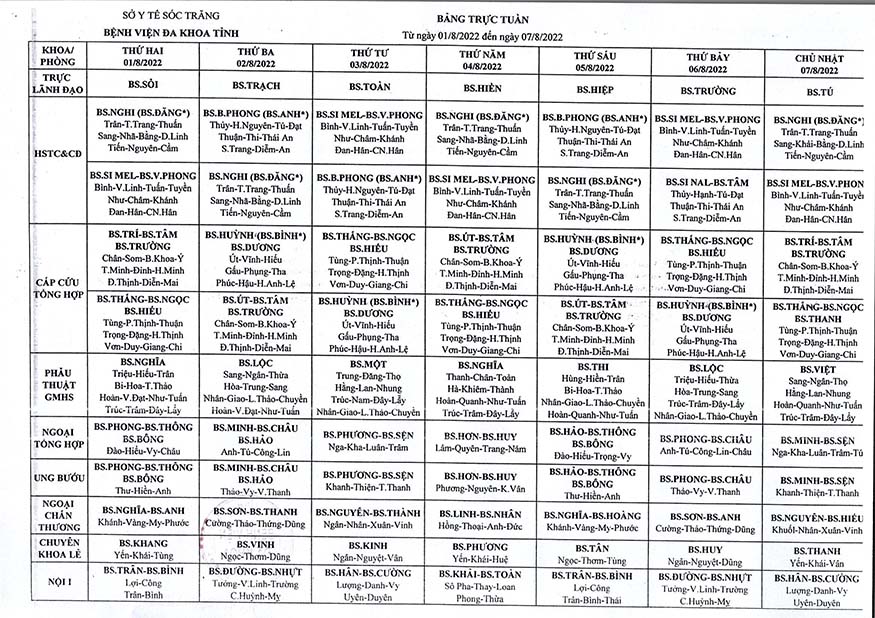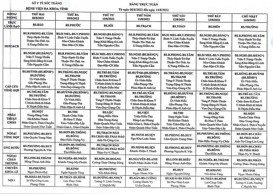LỊCH TRỰC TUẦN TỪ NGÀY 08/08/2022 ĐẾN NGÀY 14/8/2022