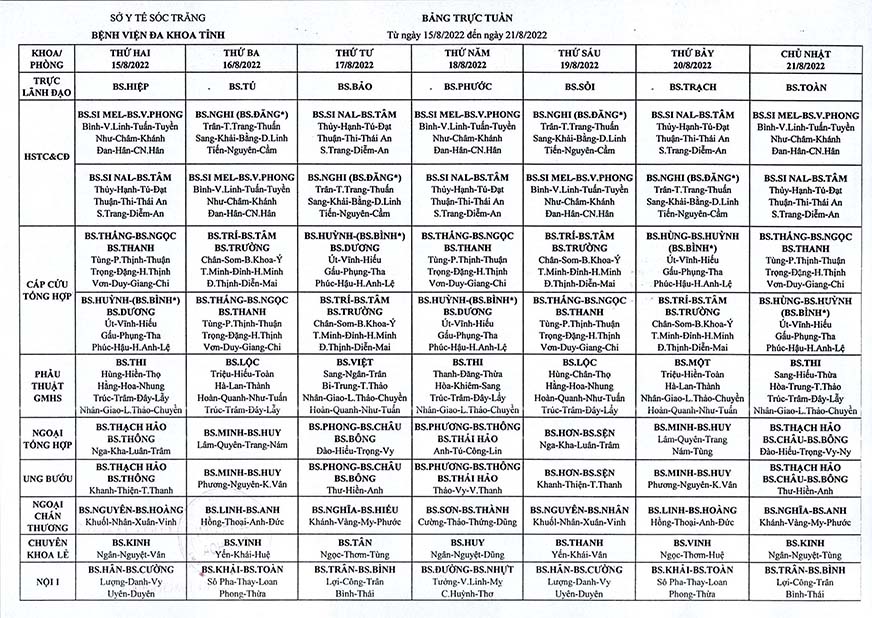 LỊCH TRỰC TUẦN TỪ NGÀY 15/8/2022 ĐẾN NGÀY 21/8/2022