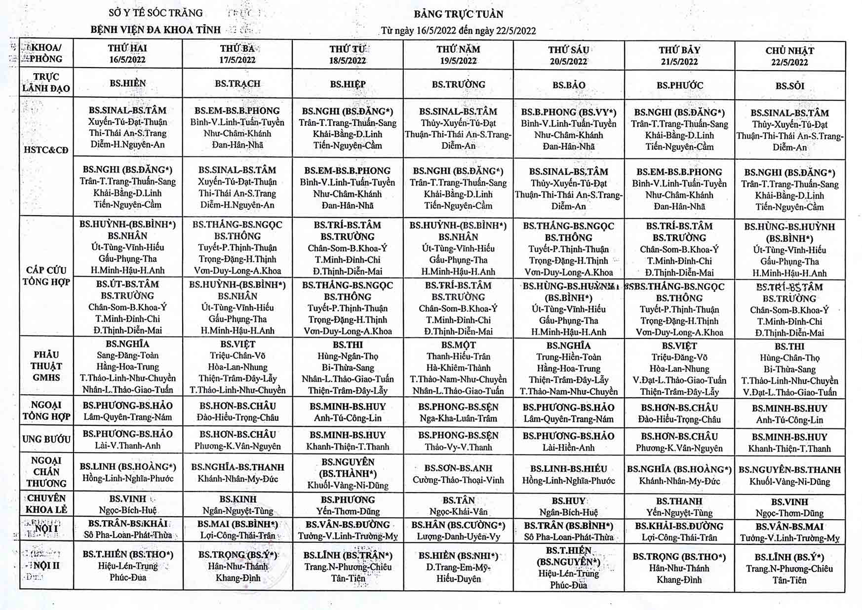 LỊCH TRỰC TUẦN TỪ NGÀY 16/5/2022 ĐẾN NGÀY 22/5/2022
