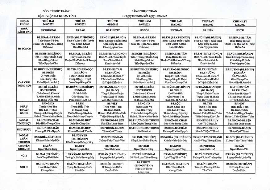 LỊCH TRỰC TUẦN TỪ NGÀY 06/06/2022 ĐẾN NGÀY 12/6/2022