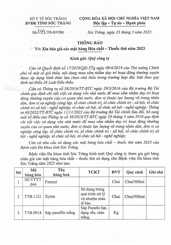 THÔNG BÁO v/v xin báo giá các mặt hàng Hóa chất – Thuốc thử năm 2023