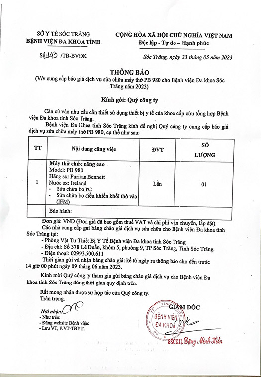 THÔNG BÁO v/v cung cấp báo giá dịch vụ sửa chữa máy thở PB 980