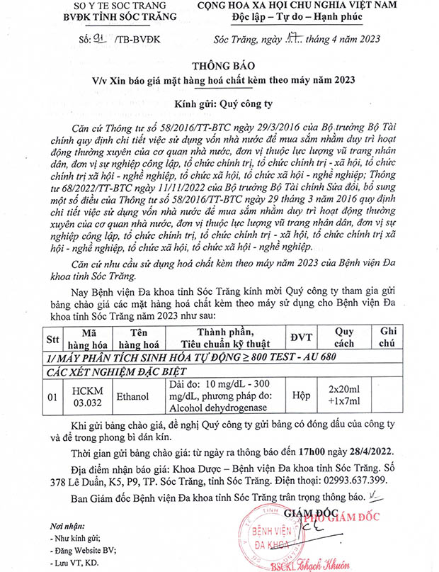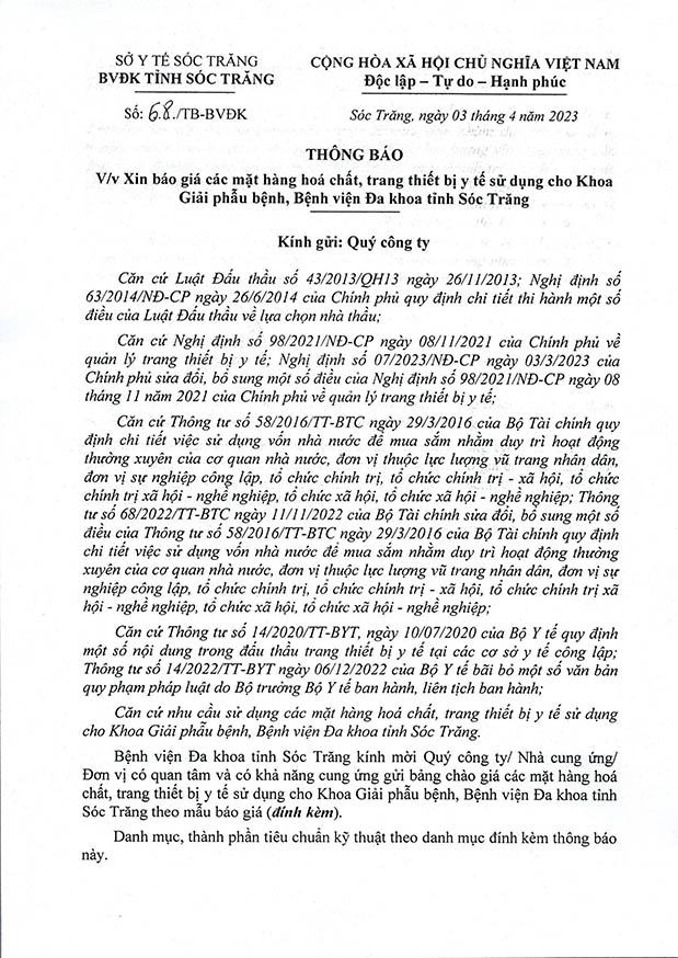 THÔNG BÁO v/v xin Giá các mặt hàng hóa chất, trang thiết bị y tế sử dụng cho Khoa Giải phẫu bệnh – Bệnh viện Đa khoa tỉnh Sóc Trăng