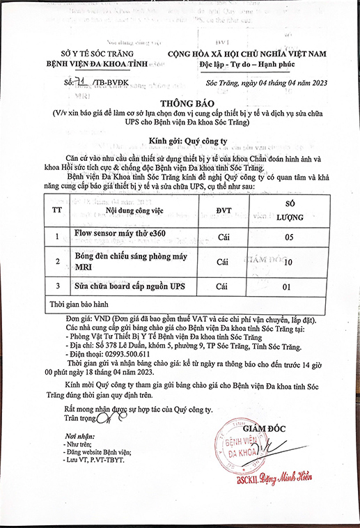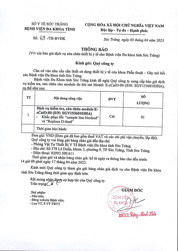 THÔNG BÁO v/v xin báo giá dịch vụ sửa chữa thiết bị y tế cho Bệnh viện Đa khoa tỉnh Sóc Trăng