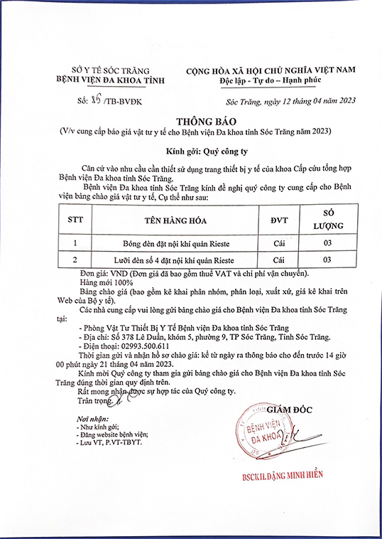 THÔNG BÁO v/v cung cấp báo giá vật tư y tế cho Bệnh viện Đa khoa tỉnh Sóc Trăng năm 2023