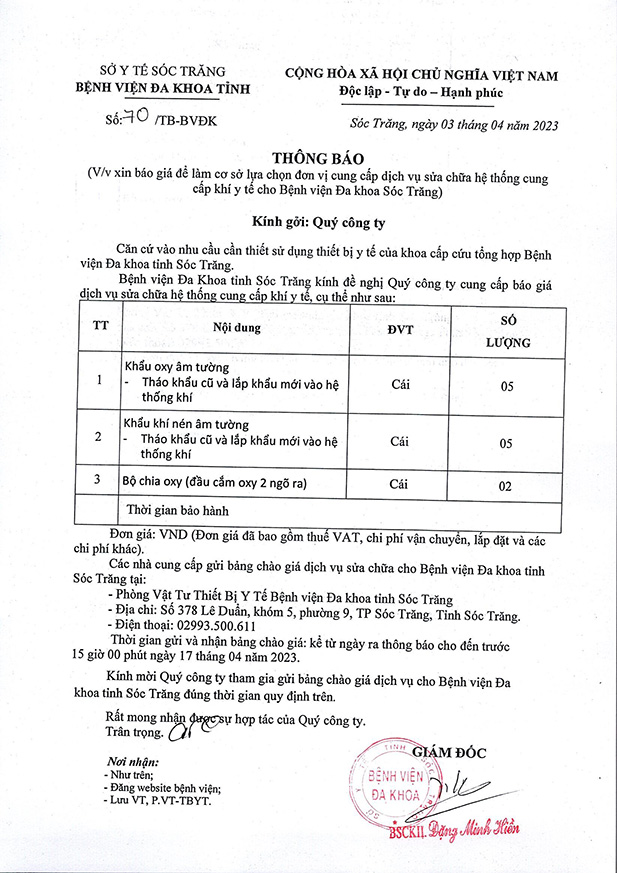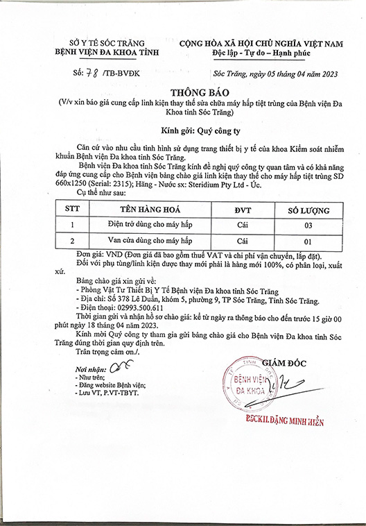 THÔNG BÁO v/v xin báo giá cung cấp linh kiện thay thế sửa chữa máy hấp tiệt trùng của Bệnh viện Đa khoa tỉnh Sóc Trăng