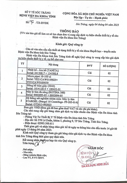 THÔNG BÁO v/v xin báo giá để làm cơ sở lựa chọn đơn vị cung cấp dịch vụ hiệu chuẩn thiết bị y tế cho Bệnh viện Đa khoa tỉnh Sóc Trăng