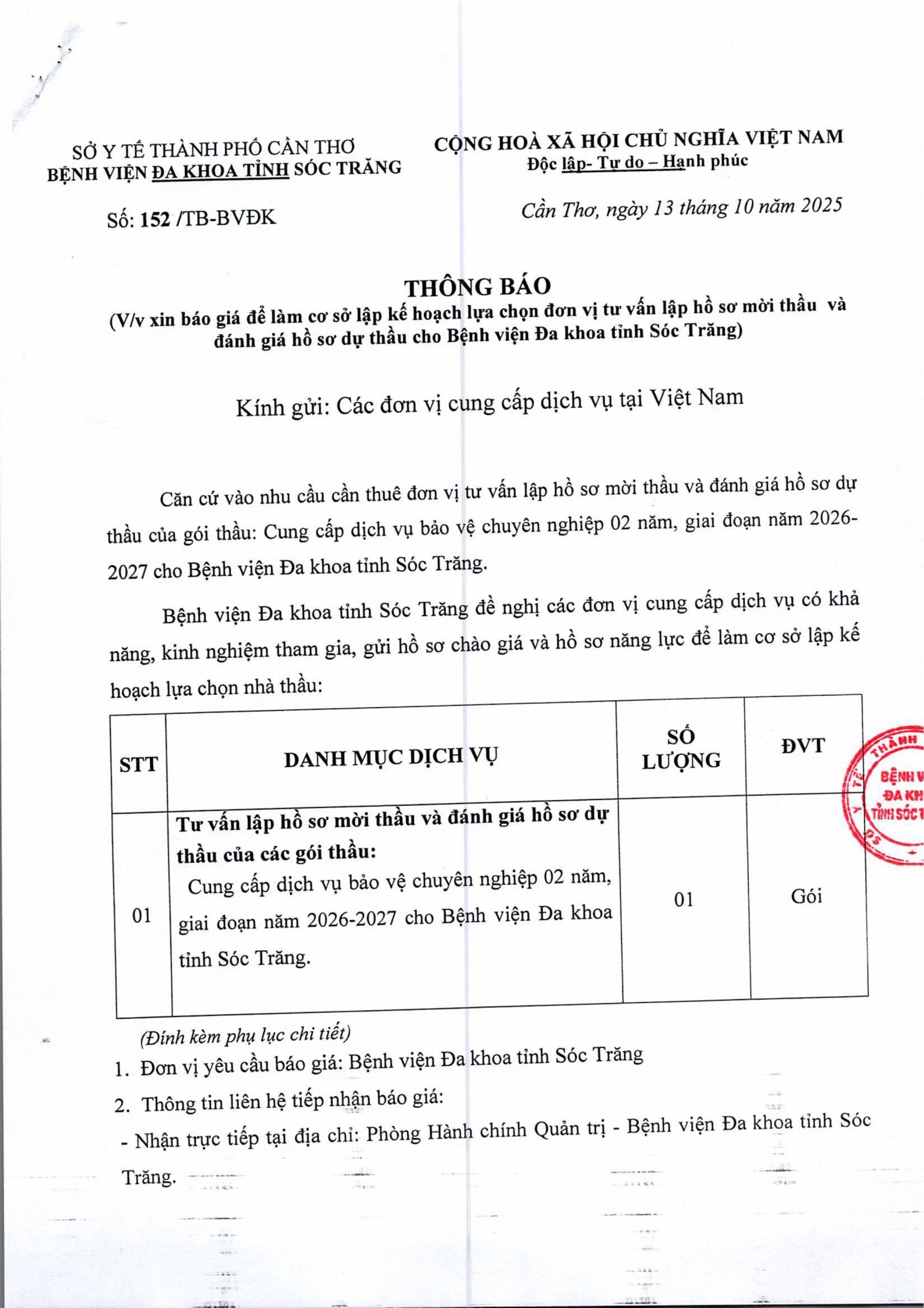 THÔNG BÁO Số 152/TB-BVĐK ngày 13/10/2025 V/v xin báo giá để làm cơ sở lập kế hoạch lựa chọn đơn vị tư vấn lập hồ sơ mời thầu và đánh giá hồ sơ dự thầu cho Bệnh viện Đa khoa tỉnh Sóc Trăng