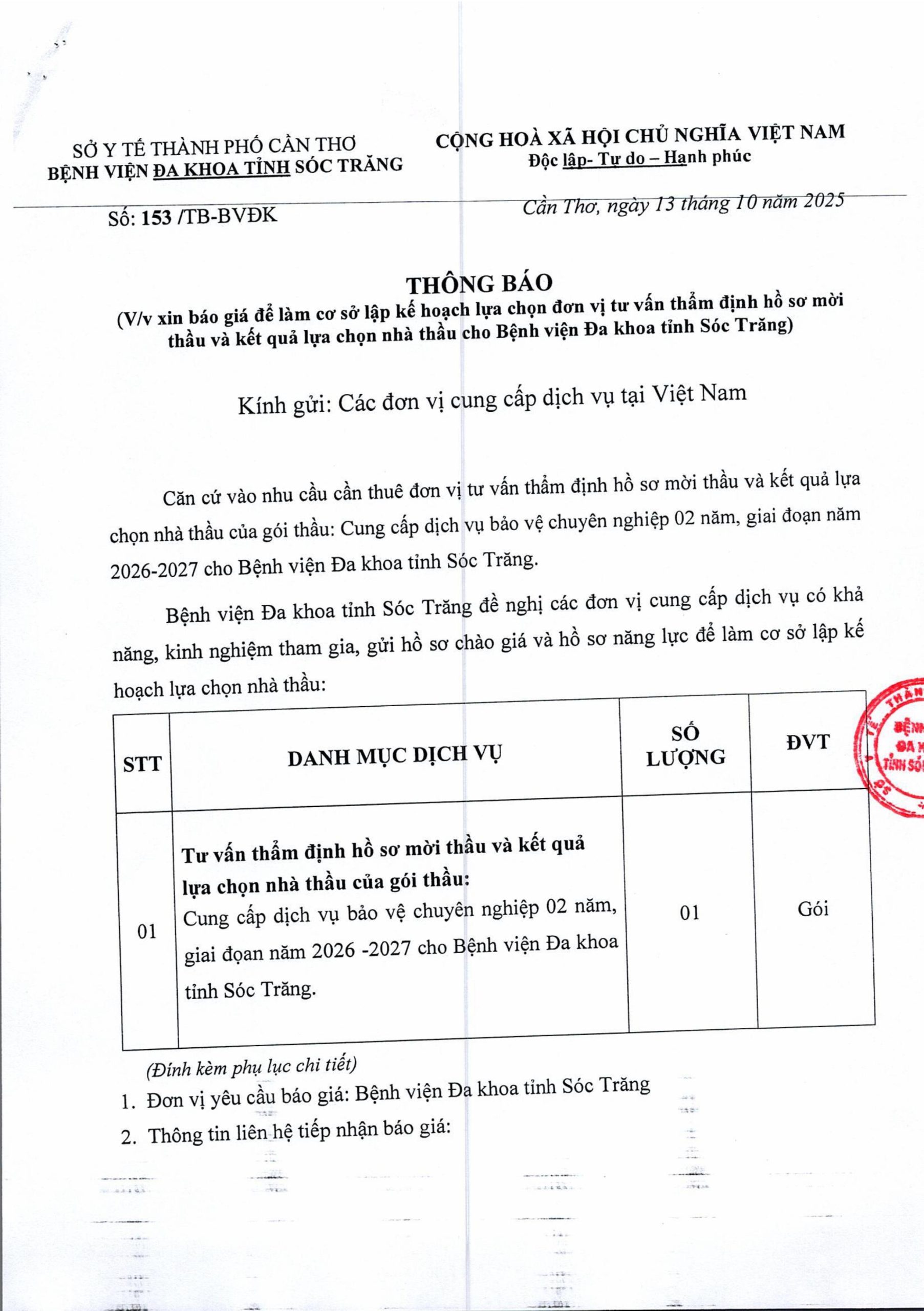 THÔNG BÁO Số 153/TB-BVĐK ngày 13/10/2025 V/v xin báo giá để làm cơ sở lập kế hoạch lựa chọn đơn vị tư vấn thẩm định hồ sơ mời thầu và kết quả lựa chọn nhà thầu cho Bệnh viện Đa khoa tỉnh Sóc Trăng