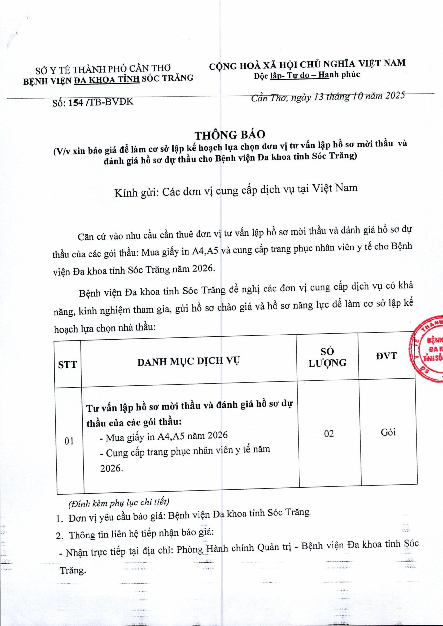 THÔNG BÁO Số 154/TB-BVĐK ngày 13/10/2025 V/v xin báo giá để làm cơ sở lập kế hoạch lựa chọn đơn vị tư vấn lập hồ sơ mời thầu và đánh giá hồ sơ dự thầu cho Bệnh viện Đa khoa tỉnh Sóc Trăng